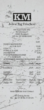 Wichtig sind neben dem Namen des Supermarktes, die Straße, das Datum, die Uhrzeit und die Summe, die auf der Quittung angegeben sind. Außerdem wurden ein paar interessante Artikel gekauft.