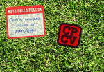 Una spilla rossa del Corpo di Protezione Civile di Villasetia.