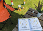 La piazzola da campeggio di Antje ed Ernst de Jong. Si intravedono un libro aperto sulle api e alcuni nani da giardino sullo sfondo.