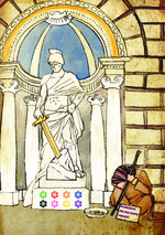 Nella foto della statua del gladiatore si può notare una mendicante. Inoltre, dei simboli colorati simili a fiori sono applicati alla base della statua.